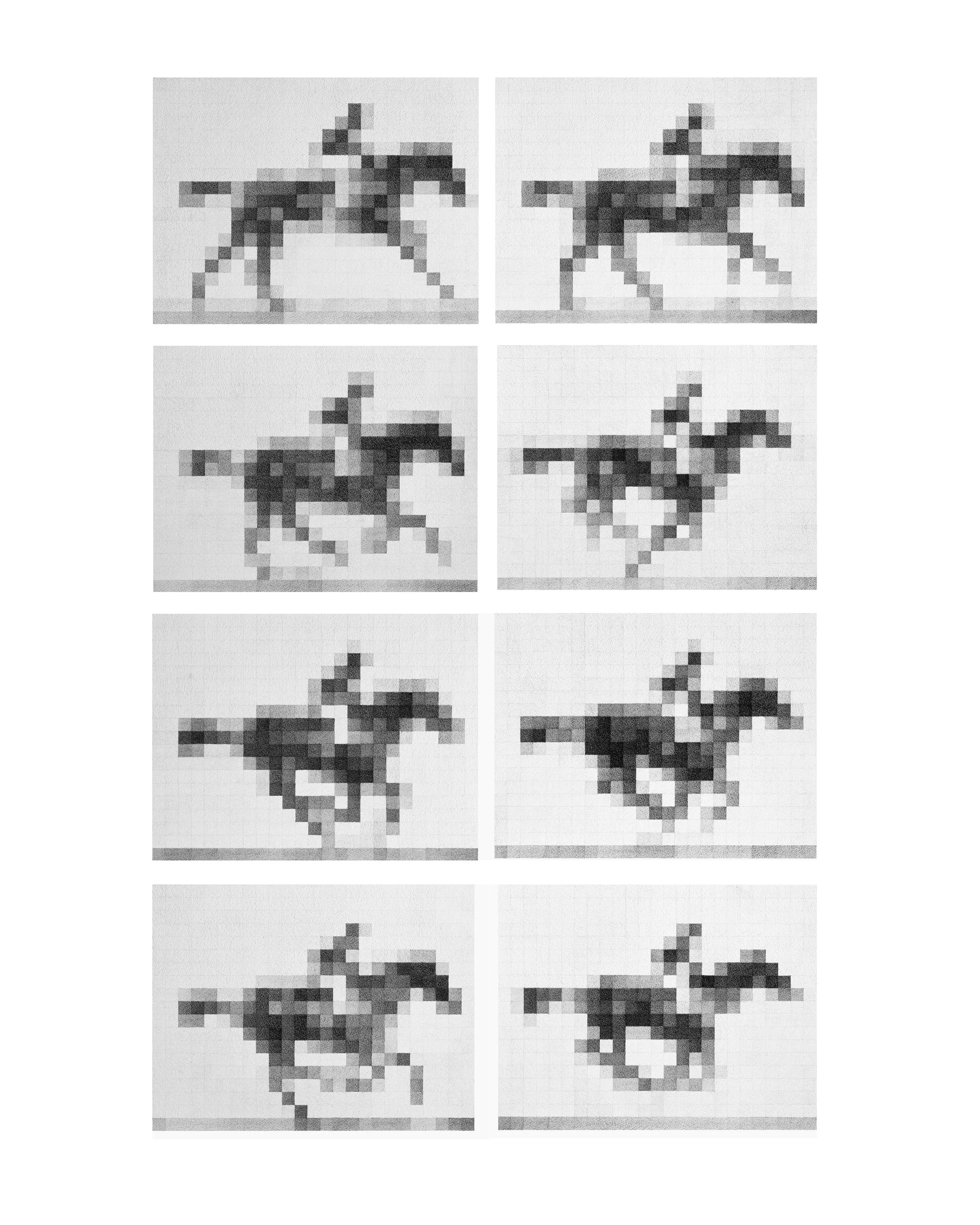 Muybridge's 1887 Animal Locomotion, as seen by MAESTRO. These are the first eight frames of the historic animation, drawn through my signature pixelated lens as part of my ongoing LOADING series. Though the drawings before you in the gallery stand on their own, this page represents an ongoing digital exploration of the animation. I arrest it, transform selected frames into sculpture, then set its pixelated abstractions into motion once more. As I work, I find myself questioning: what is lost and what is gained through the innumerable transformations, deaths, and rebirths that technology makes possible?